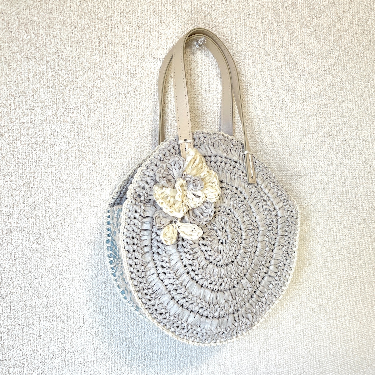 和紙のテープヤーンで編んだ丸いバッグです。
