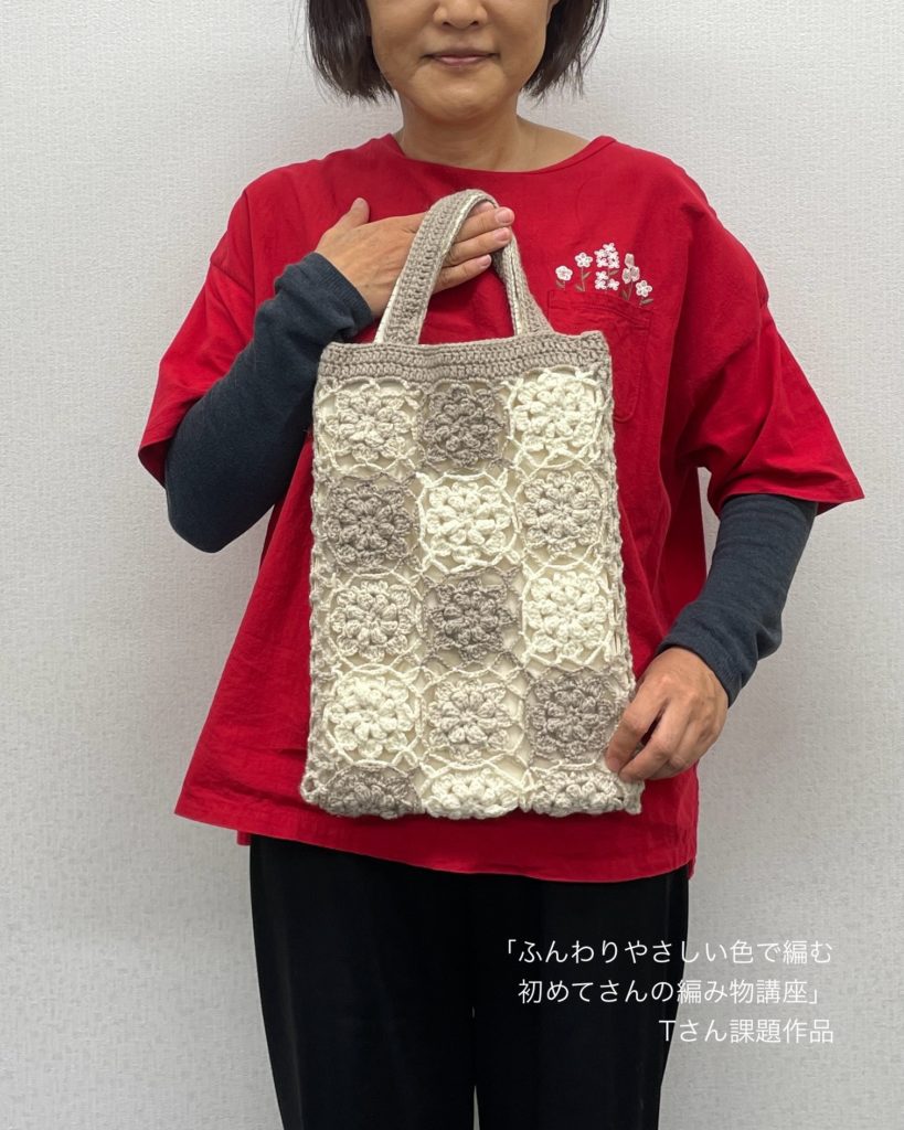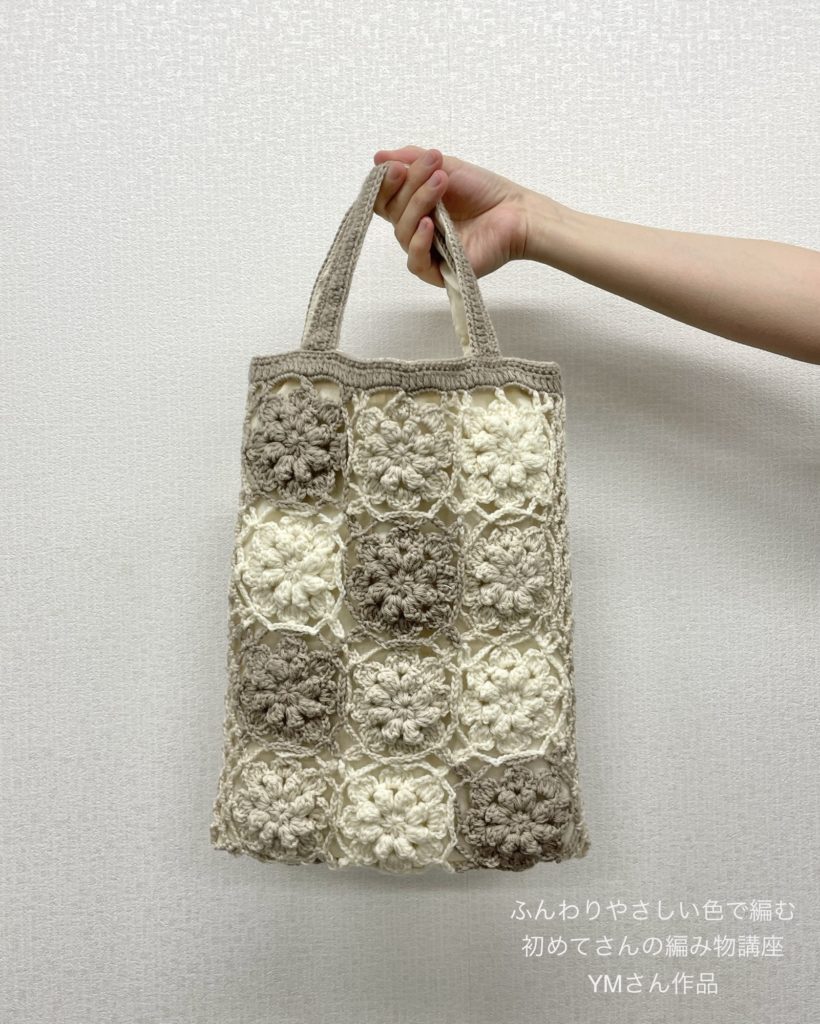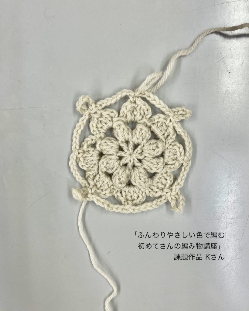 「ふんわりやさしい色で編む 初めてさんの編み物講座」を受講中の生徒さんのご紹介です。