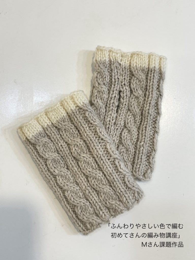 次回から、ステップアップのレッスンで「縄柄のハンドウォーマー」を編みます。